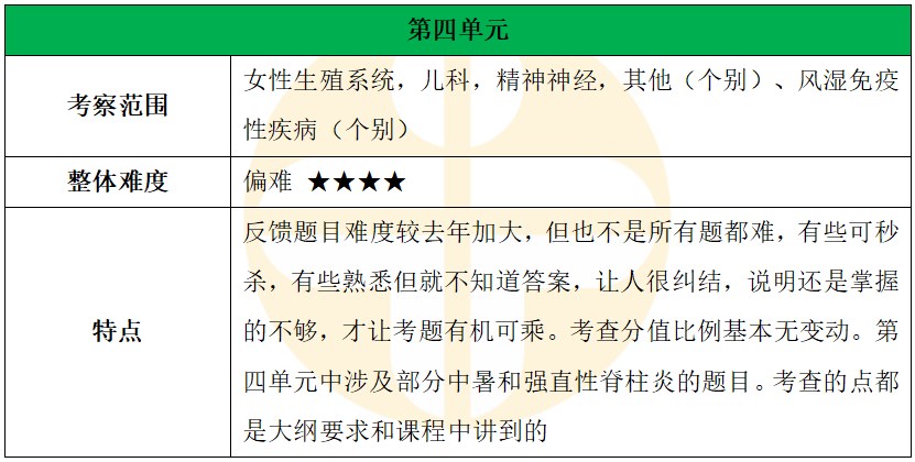 3.各單元的題型題量:前三個(gè)單元基本和往年基本一致,第四單元A3型題有所增加,A2型題數(shù)量減少,浮動(dòng)在十分左右。具體如下: