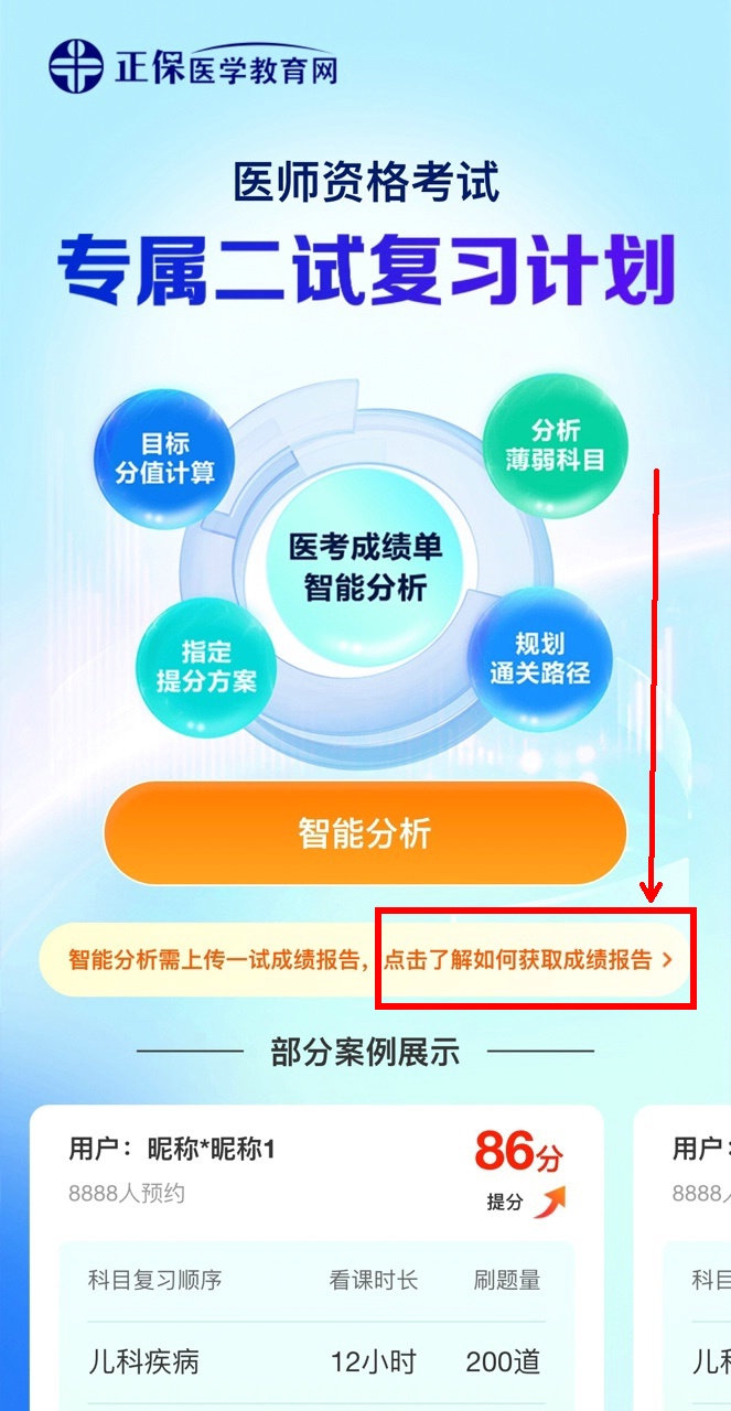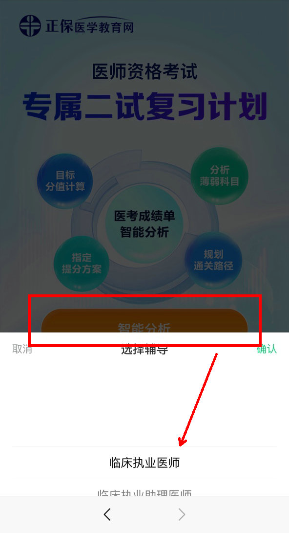 (1)點(diǎn)擊頁面“智能分析”,選擇對(duì)應(yīng)的考試類別入口,比如:臨床執(zhí)業(yè)醫(yī)師;
