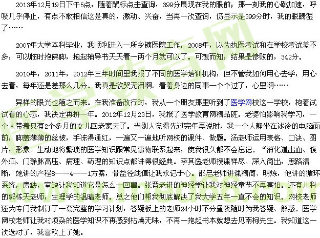2013年的征文活動總是不乏精彩的文章。我的醫(yī)考之路——我的夢想成真了(學(xué)員:QQ1622158054),讓文章帶我們走進他的醫(yī)考之路。