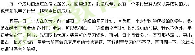 醫(yī)考之路不容易,容易做不成大事情。我的醫(yī)考之路是用艱辛鋪就的成功之路。遙想當(dāng)年選擇學(xué)醫(yī),就鑄定了這是一條不容易走的艱辛之路。我選了,我就不曾后悔,我將會為我的理想而努力,我們年輕人,有的就是充沛的精力。