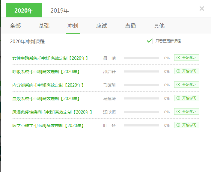 考生注意!2020年臨床執(zhí)業(yè)醫(yī)師沖刺精講班的課程已經(jīng)陸續(xù)開(kāi)通啦!