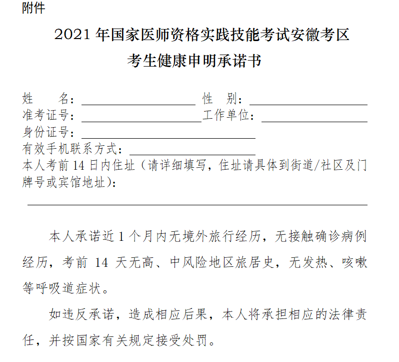 2021年全國醫(yī)師資格實踐技能考試安徽考區(qū)考生健康申明承諾書
