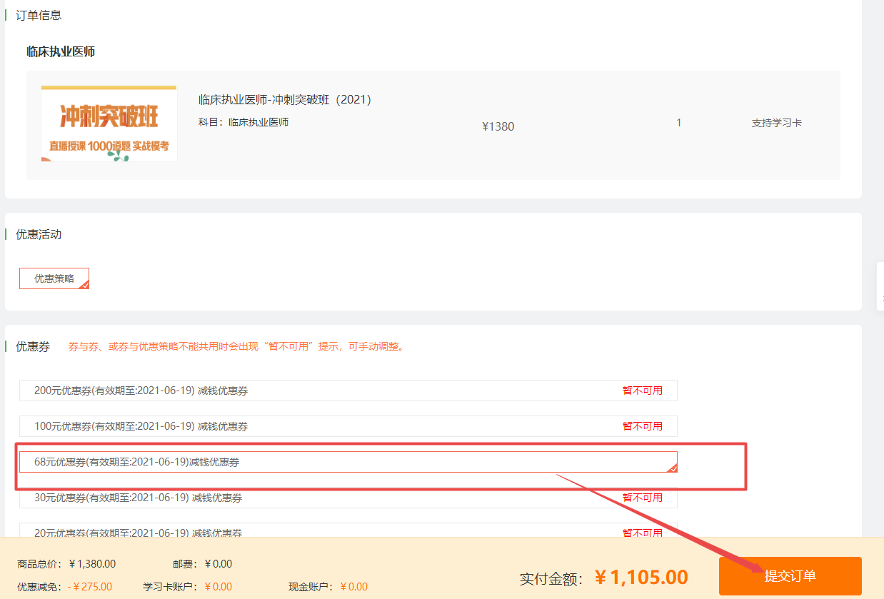 第四步:勾選68元優(yōu)惠券,最后到手價為1105元;
