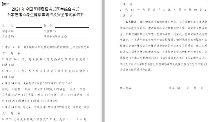 2021年全國(guó)醫(yī)師資格考試醫(yī)學(xué)綜合考試石家莊考點(diǎn)考生健康申明卡及安全考試承諾書