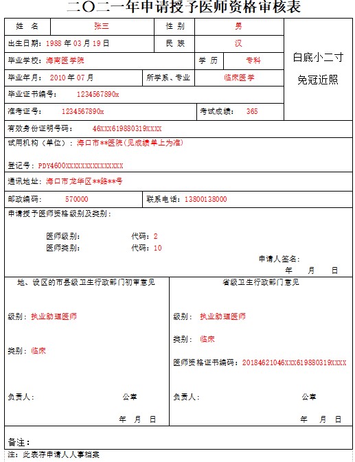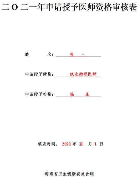 二O二一年申請授予醫(yī)師資格審核表模板及填寫說明,大家可以參考??凇?a href="http://www.tymfj.cn/yishizigekaoshi/chengji/su2111048440.shtml" articlerela="4634284" target="_blank" style="white-space: normal;">??谑行l(wèi)生健康委員會關(guān)于提交2021執(zhí)業(yè)(助理)醫(yī)師成績單及醫(yī)師資格審核表的通知》,下面是相關(guān)模板。