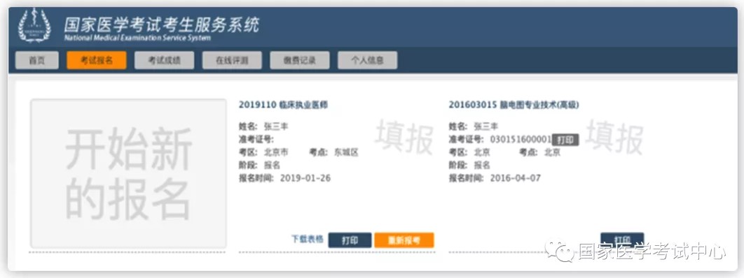 答:如需修改個人報名信息,須在網上報名截止日前,再次登陸服務平臺,進入“考試報名”欄目,在需要修改的報名下方點擊“重新報考”,進行信息修改,修改完成后務必再重新報名,報名成功后需重新打印《醫(yī)師資格考試報名暨授予醫(yī)師資格申請表》。如下圖: