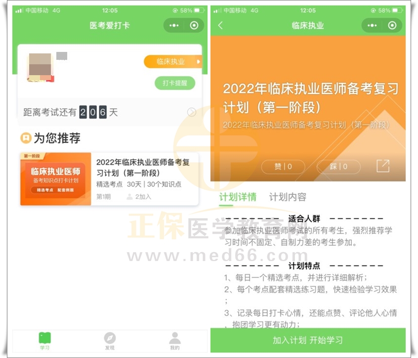第三步:選擇備考科目后即進入學習計劃選擇的頁面,請選擇“您的備考計劃”,如臨床執(zhí)業(yè)醫(yī)師備考復習計劃(第一階段),然后點擊下方“加入計劃 開始學習”按鈕,開始正式進入打卡學習。