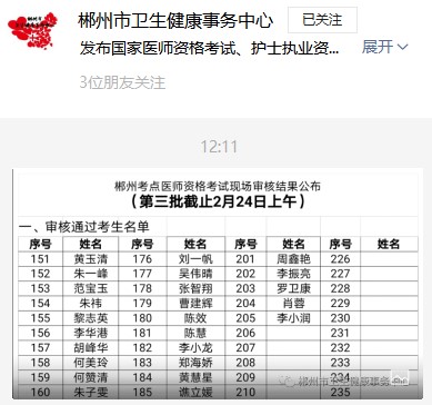 郴州考點微信公眾號三次公布現(xiàn)場審核結果合格人員名單,審核通過的考生到審核現(xiàn)場簽字確認后視為醫(yī)師資格考試報名成功。