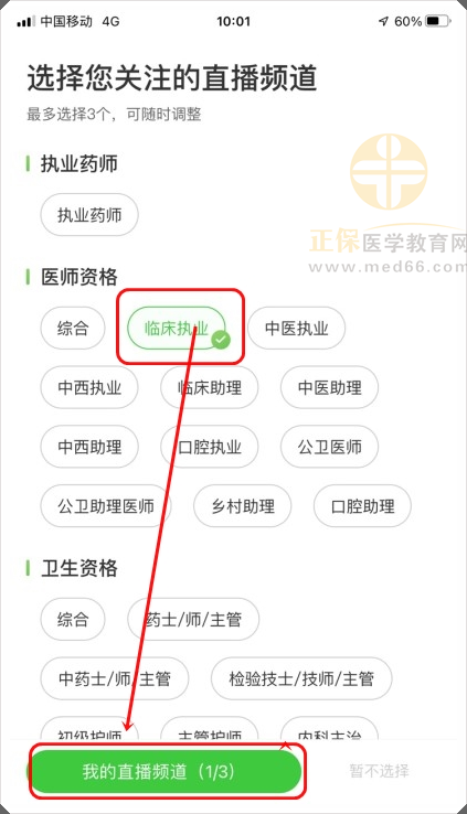 2.臨床執(zhí)業(yè)醫(yī)師考生可選擇“臨床執(zhí)業(yè)”進入直播頻道。