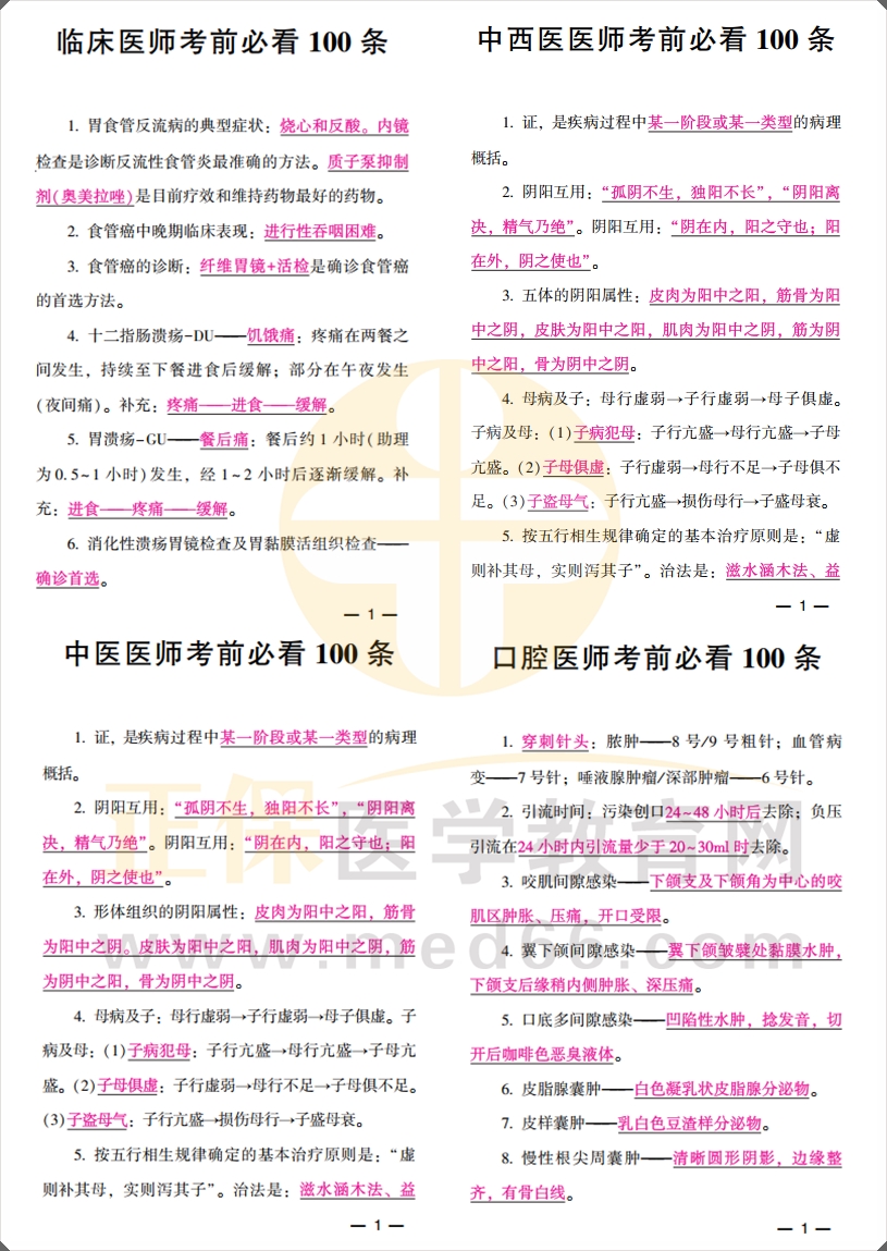醫(yī)學(xué)教育網(wǎng)的老師們整理醫(yī)師筆試【考前爆料100點(diǎn)】,總結(jié)精編考點(diǎn),考前沖刺記憶上分必備,提高你的沖刺備考能力!