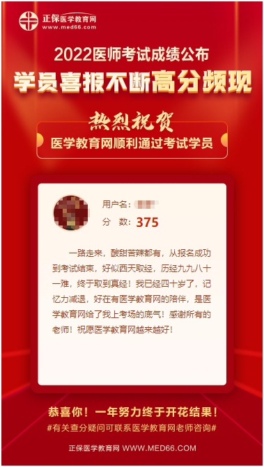 “一路走來,酸甜苦辣都有,從報名成功到考試結(jié)束,好似西天取經(jīng),歷經(jīng)九九八十一難,終于取到真經(jīng)!我已經(jīng)四十歲了,記憶力減退,好在有醫(yī)學(xué)教育網(wǎng)的陪伴,是醫(yī)學(xué)教育網(wǎng)給了我上考場的底氣!感謝所有的老師!祝愿醫(yī)學(xué)教育網(wǎng)越來越好! "