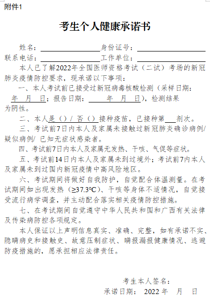 廣西考區(qū)來賓考點2022年醫(yī)師綜合考試二試所需《考生個人健康承諾書》