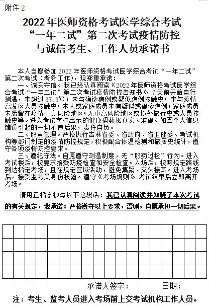 吉林白城考點2022年醫(yī)師資格考試醫(yī)學(xué)綜合考試“一年二試”第二次考試疫情防控與誠信考生、工作人員承諾書
