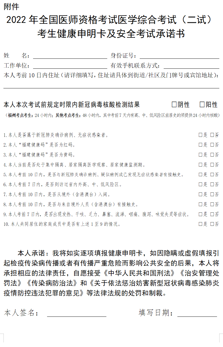 【附件下載】2022年全國醫(yī)師資格考試醫(yī)學(xué)綜合考試(二試)考生健康申明卡及安全考試承諾書