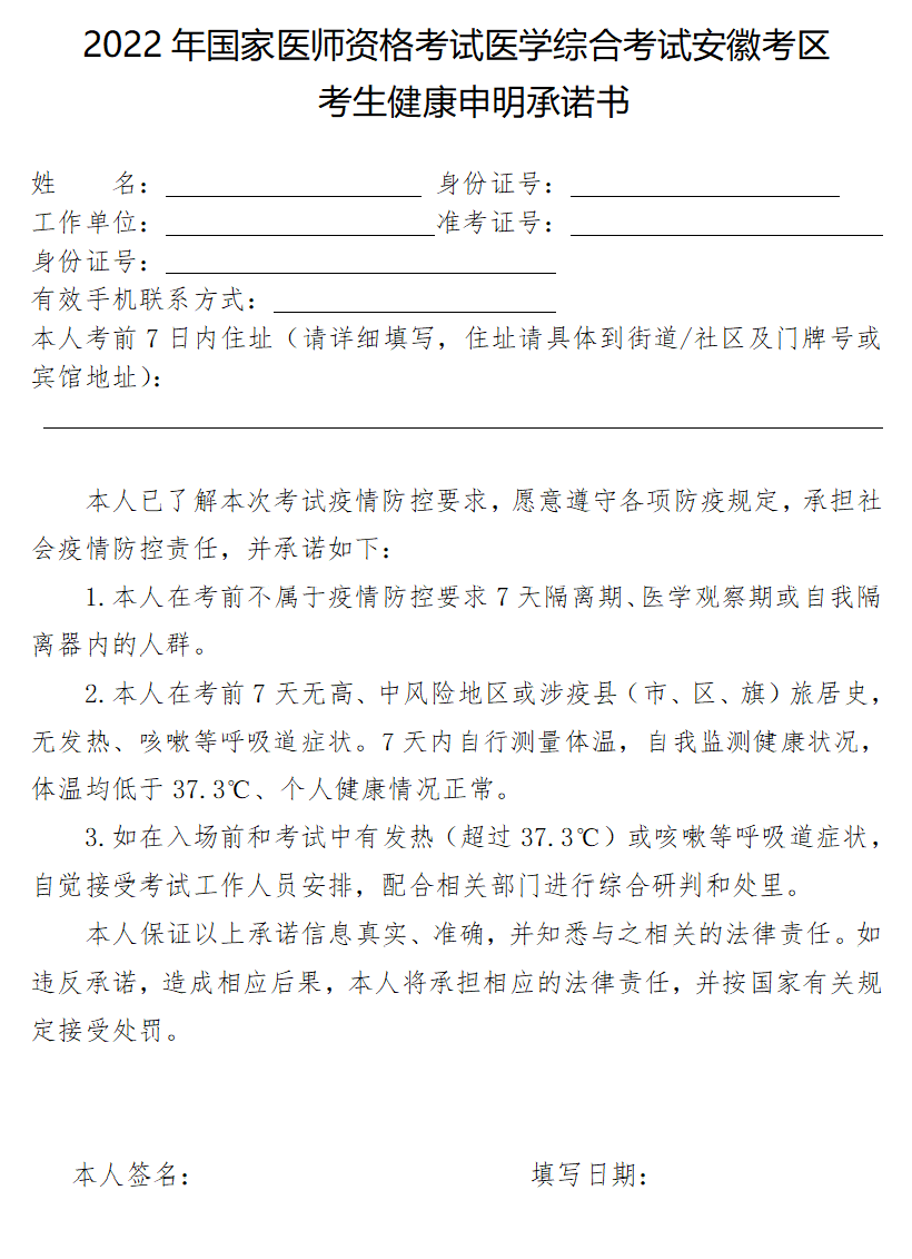 《2022年國家醫(yī)師資格考試醫(yī)學(xué)綜合考試安徽考區(qū)考生健康申明承諾書》下載