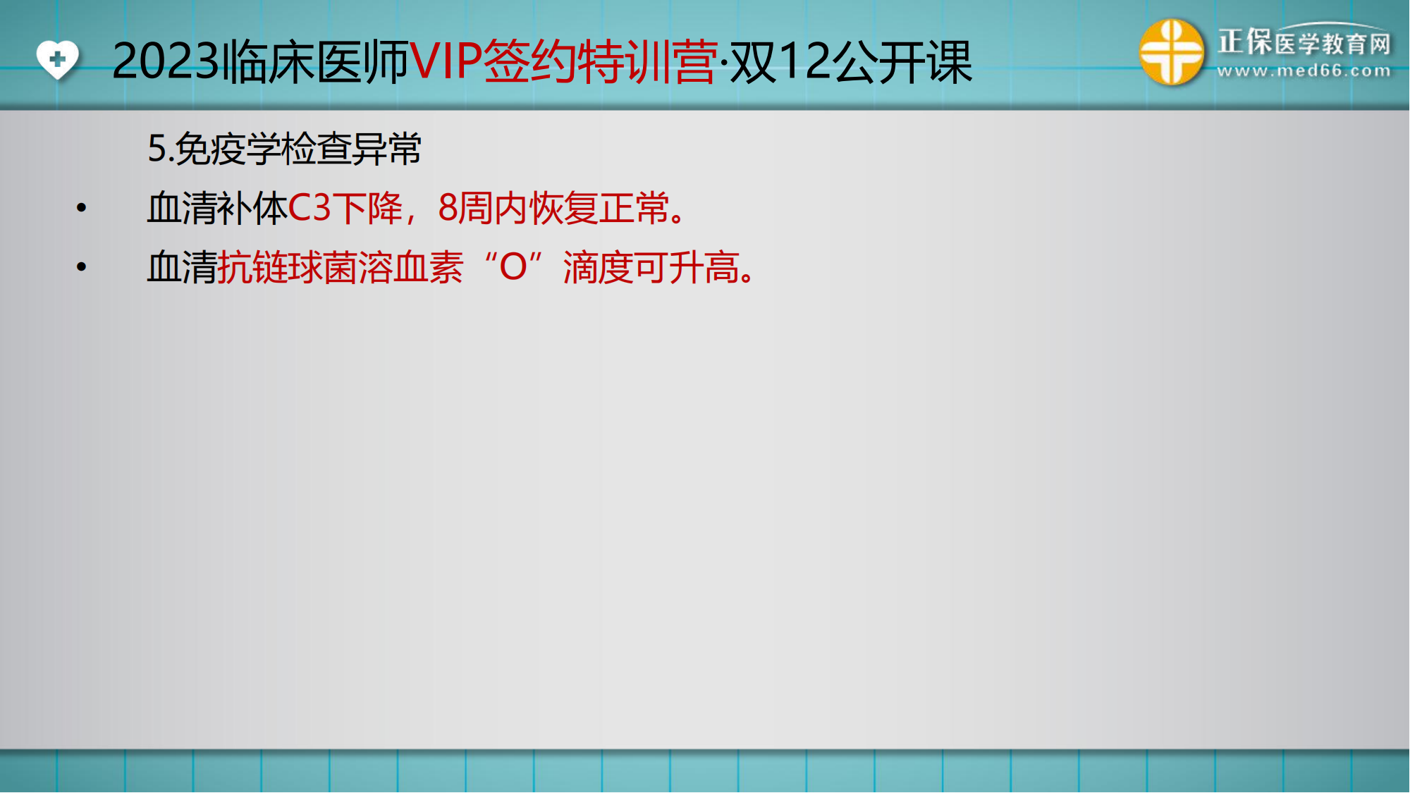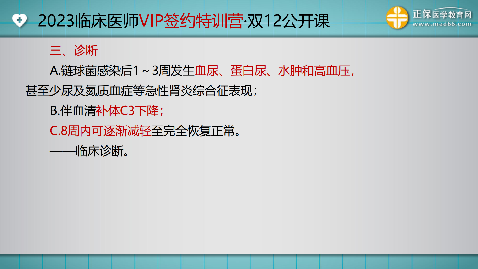 12月5日VIP講師湯以恒為大家做了一場(chǎng)公開(kāi)課,以急性腎小球腎炎(急性腎炎)為切入點(diǎn),為大家真實(shí)模擬了VIP課堂講解,聽(tīng)到的同學(xué)直呼YYDS!沒(méi)看到直播或者還想看回放的同學(xué),可以點(diǎn)擊查看回放視頻,下面小編為大家整理相關(guān)內(nèi)容如下。