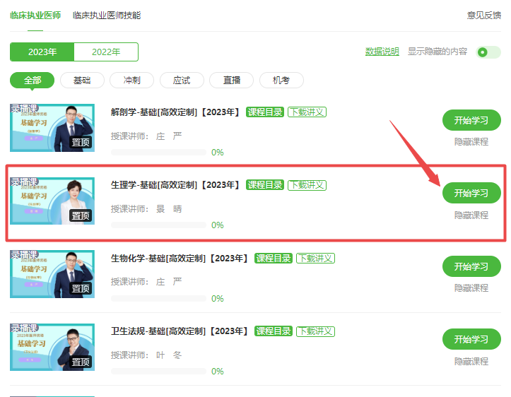 2023年醫(yī)師備考全面開(kāi)啟!2023年臨床執(zhí)業(yè)醫(yī)師基礎(chǔ)學(xué)習(xí)新課開(kāi)通!目前由景晴老師授課的《生理學(xué)》科目課程已更新!已購(gòu)課同學(xué)可以直接進(jìn)入我的網(wǎng)校我的家-我的課程-生理學(xué)科目進(jìn)行學(xué)習(xí)!關(guān)于2023年臨床執(zhí)業(yè)醫(yī)師《生理學(xué)》考試大綱/教材變動(dòng)的相關(guān)內(nèi)容,具體內(nèi)容下方查看。未購(gòu)課學(xué)員點(diǎn)擊此處進(jìn)入選擇課程>>,具體看課位置如下: