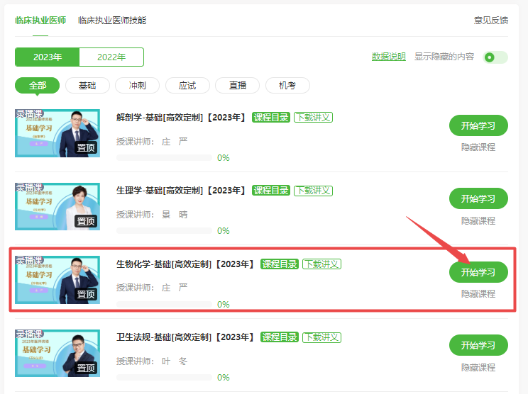 2023年醫(yī)師備考全面開啟!2023年臨床執(zhí)業(yè)醫(yī)師基礎(chǔ)學(xué)習(xí)新課開通!目前由莊嚴(yán)老師授課的《生物化學(xué)》科目課程已更新!已購(gòu)課同學(xué)可以直接進(jìn)入我的網(wǎng)校我的家-我的課程-生物化學(xué)科目進(jìn)行學(xué)習(xí)!關(guān)于2023年臨床執(zhí)業(yè)醫(yī)師《生物化學(xué)》考試大綱/教材變動(dòng)的相關(guān)內(nèi)容,具體內(nèi)容下方查看。未購(gòu)課學(xué)員點(diǎn)擊此處進(jìn)入選擇課程>>,具體看課位置如下: