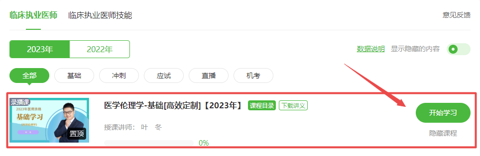 2023年醫(yī)師備考全面開啟!2023年臨床執(zhí)業(yè)醫(yī)師基礎學習新課開通!目前由葉冬老師授課的《醫(yī)學倫理學》科目課程已更新!已購課同學可以直接進入我的網校我的家-我的課程-醫(yī)學倫理學科目進行學習!關于2023年臨床執(zhí)業(yè)醫(yī)師《醫(yī)學倫理學》考試大綱/教材變動的相關內容,具體內容下方查看。未購課學員點擊此處進入選擇課程>>,具體看課位置如下: