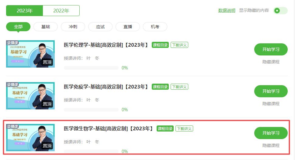 2023年醫(yī)師備考全面開啟!2023年臨床執(zhí)業(yè)醫(yī)師基礎(chǔ)學(xué)習(xí)新課開通!目前由葉冬老師授課的《醫(yī)學(xué)微生物學(xué)》科目課程已更新!已購課同學(xué)可以直接進(jìn)入我的網(wǎng)校我的家-我的課程-醫(yī)學(xué)微生物學(xué)科目進(jìn)行學(xué)習(xí)!關(guān)于2023年臨床執(zhí)業(yè)醫(yī)師《醫(yī)學(xué)微生物學(xué)》考試大綱/教材變動(dòng)的相關(guān)內(nèi)容,具體內(nèi)容下方查看。未購課學(xué)員點(diǎn)擊此處進(jìn)入選擇課程>>,具體看課位置如下: