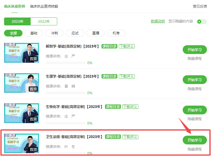 2023年醫(yī)師備考全面開(kāi)啟!2023年臨床執(zhí)業(yè)醫(yī)師基礎(chǔ)學(xué)習(xí)新課開(kāi)通!目前由葉冬老師授課的《衛(wèi)生法規(guī)》科目課程已更新!已購(gòu)課同學(xué)可以直接進(jìn)入我的網(wǎng)校我的家-我的課程-衛(wèi)生法規(guī)科目進(jìn)行學(xué)習(xí)!關(guān)于2023年臨床執(zhí)業(yè)醫(yī)師《衛(wèi)生法規(guī)》考試大綱/教材變動(dòng)的相關(guān)內(nèi)容,具體內(nèi)容下方查看。未購(gòu)課學(xué)員點(diǎn)擊此處進(jìn)入選擇課程>>,具體看課位置如下: