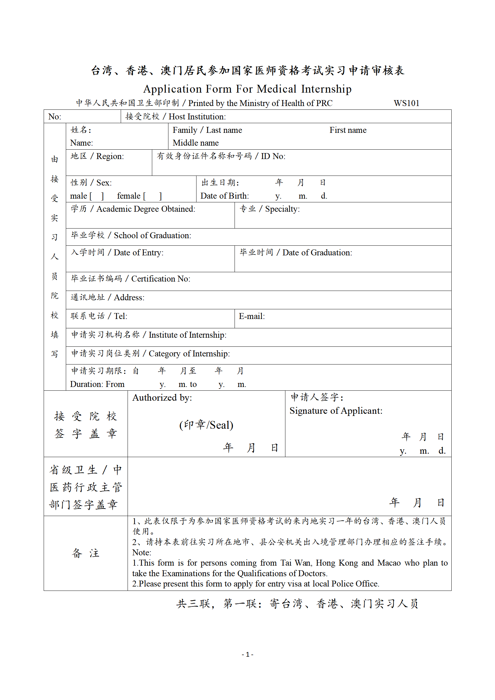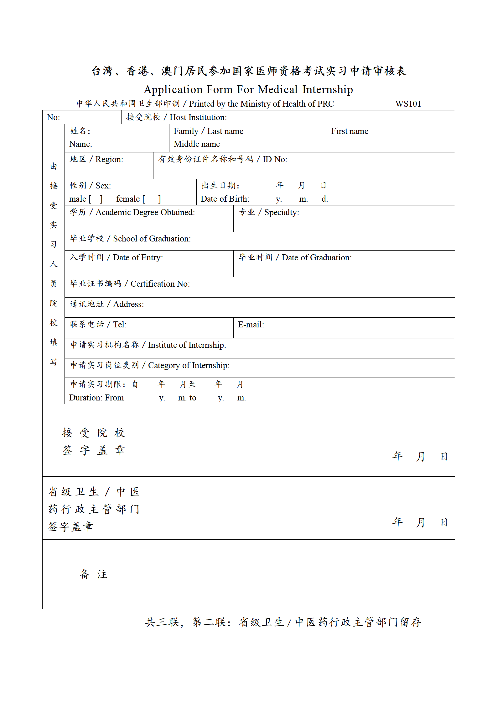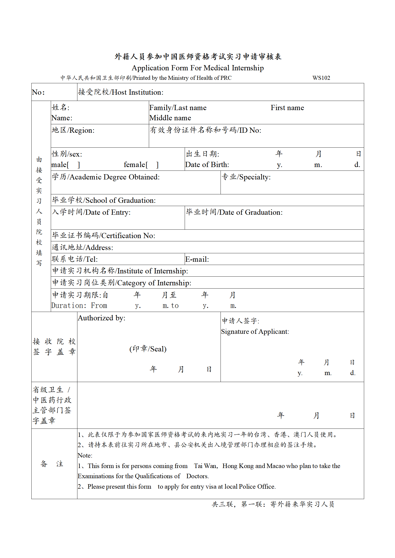 在國(guó)家醫(yī)學(xué)考試中心網(wǎng)站報(bào)名之后,臺(tái)灣、香港、澳門(mén)居民及外籍人員參加醫(yī)師資格考試,需要提供《港澳臺(tái)及外籍人員參加醫(yī)師資格考試實(shí)習(xí)申請(qǐng)審核表》進(jìn)行資格審核。臺(tái)灣、香港、澳門(mén)居民及外籍人員參加國(guó)家醫(yī)師資格考試實(shí)習(xí)申請(qǐng)審核表下載地址如下: