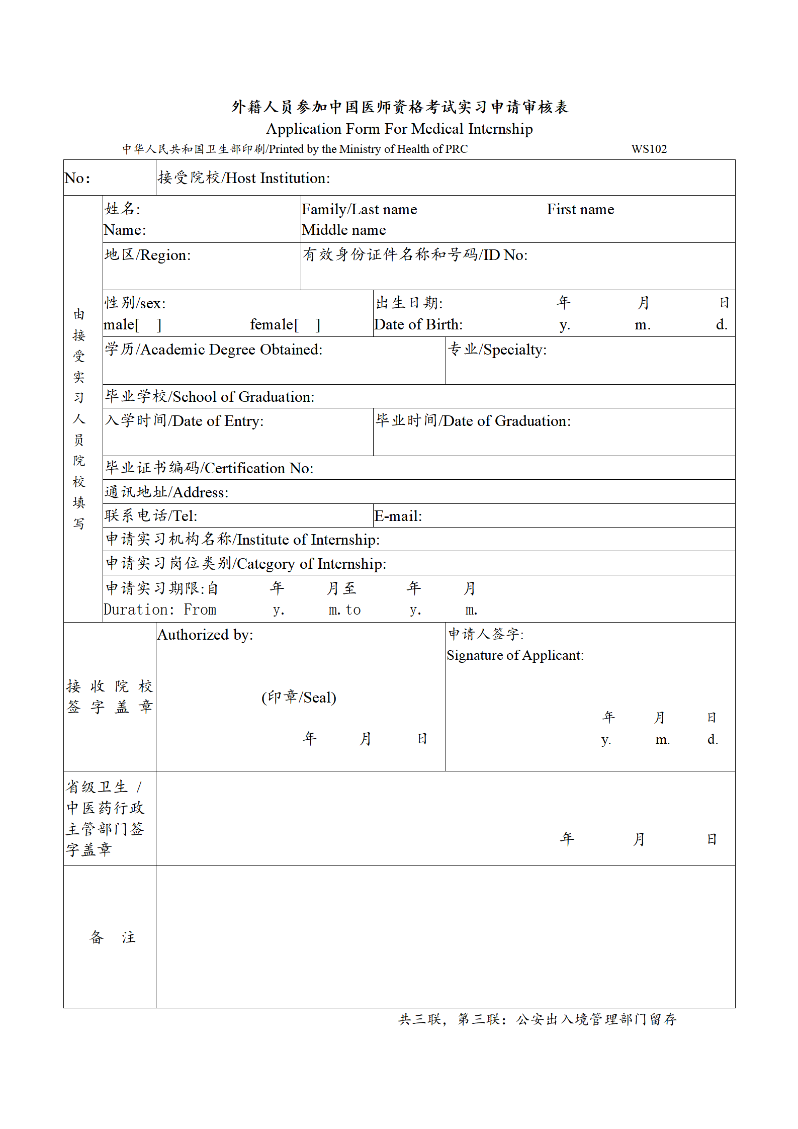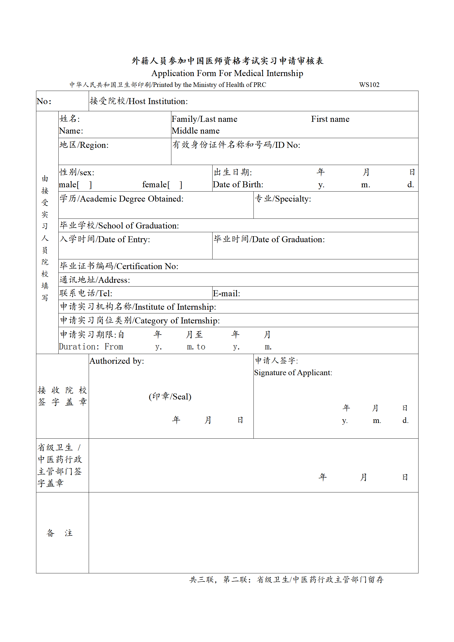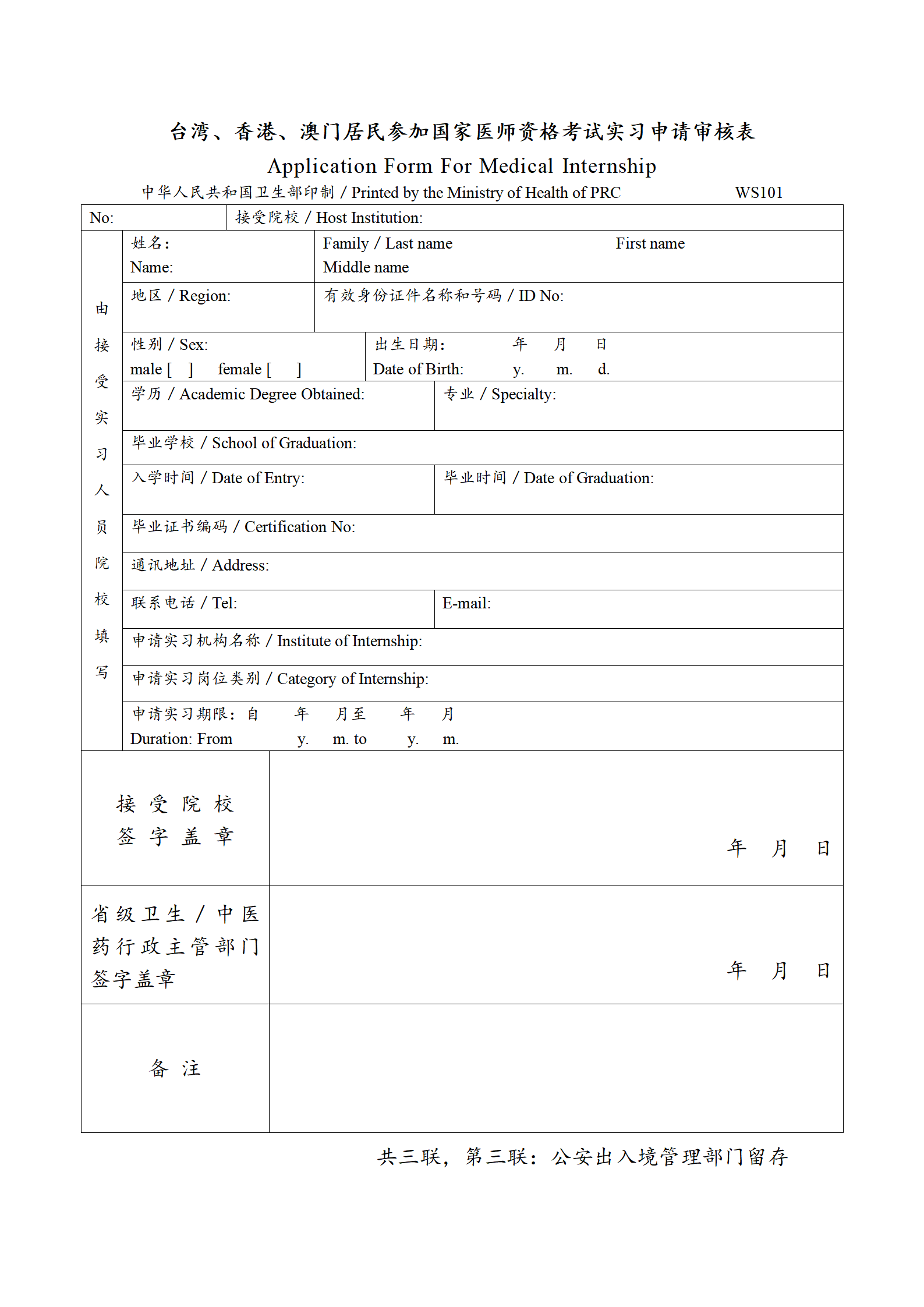 在國(guó)家醫(yī)學(xué)考試中心網(wǎng)站報(bào)名之后,臺(tái)灣、香港、澳門(mén)居民及外籍人員參加醫(yī)師資格考試,需要提供《港澳臺(tái)及外籍人員參加醫(yī)師資格考試實(shí)習(xí)申請(qǐng)審核表》進(jìn)行資格審核。臺(tái)灣、香港、澳門(mén)居民及外籍人員參加國(guó)家醫(yī)師資格考試實(shí)習(xí)申請(qǐng)審核表下載地址如下: