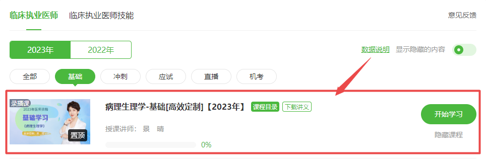 2023年醫(yī)師備考全面開啟!2023年臨床執(zhí)業(yè)醫(yī)師基礎(chǔ)學(xué)習(xí)新課開通!目前由景晴老師授課的《病理生理學(xué)》科目課程已更新!已購課同學(xué)可以直接進(jìn)入我的網(wǎng)校我的家-我的課程-病理生理學(xué)科目進(jìn)行學(xué)習(xí)!關(guān)于2023年臨床執(zhí)業(yè)醫(yī)師《病理生理學(xué)》考試大綱/教材變動的相關(guān)內(nèi)容,具體內(nèi)容下方查看。未購課學(xué)員點(diǎn)擊此處進(jìn)入選擇課程>>,具體看課位置如下: