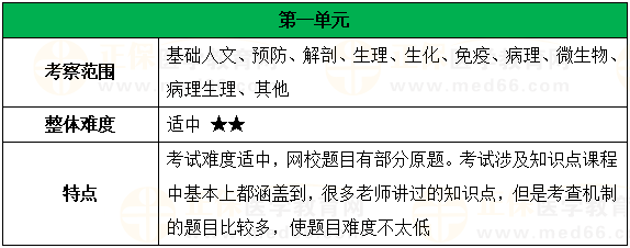 3.大部分在考察機(jī)制等,可見機(jī)制仍是第一單元考察的重點(diǎn),范圍包括基礎(chǔ)人文、預(yù)防、解剖、生理、免疫、病理、微生物、病理生理、其他(沒有藥理);題目沒有特別難理解的,只是考察機(jī)制比較多,有的學(xué)員反饋偏難。