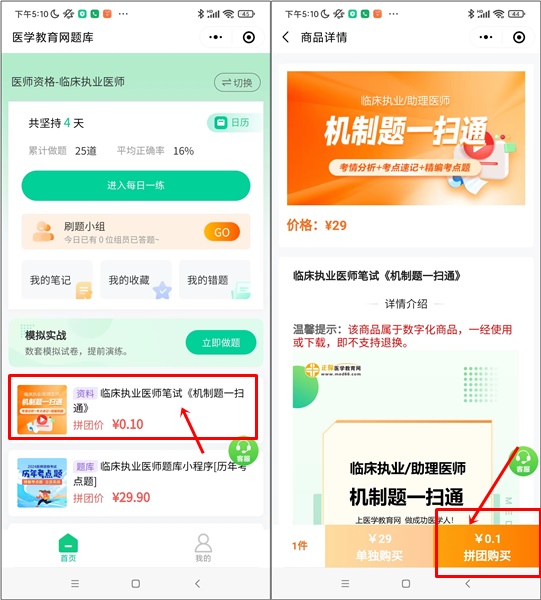 臨床執(zhí)業(yè)醫(yī)師為例,選擇“臨床執(zhí)業(yè)醫(yī)師”,下滑到底部選擇“臨床執(zhí)業(yè)醫(yī)師筆試《機制題一掃通》”,限時拼團價僅需0.1!