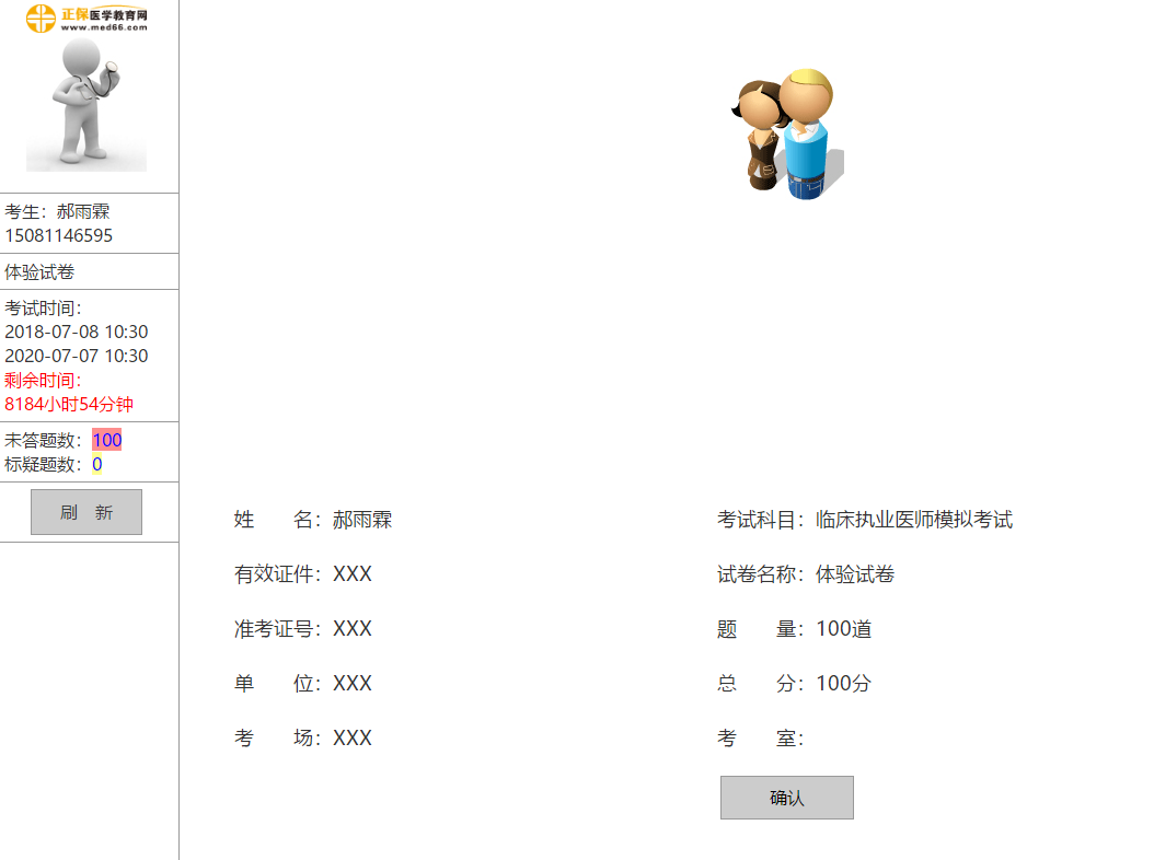 考生打開考試系統(tǒng)后,(國家醫(yī)學(xué)考試網(wǎng)官網(wǎng):輸入兩次準(zhǔn)考證號和有效證件號碼),然后點擊“進入”按鈕,進入考試系統(tǒng)。http://www2.nmec.org.cn/exam/