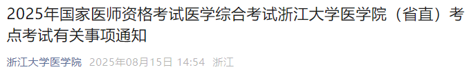 各有關(guān)單位及各位考生:大家好!根據(jù)根據(jù)《國家衛(wèi)生健康委員會醫(yī)師資格考試委員會公告》(2025年第1號)和《浙江省醫(yī)師資格考試考試領(lǐng)導(dǎo)小組公告》(第27號)相關(guān)規(guī)定,2025年國家醫(yī)師資格考試醫(yī)學(xué)綜合考試將于8月22-24日開考。浙江大學(xué)醫(yī)學(xué)院作為浙江省省直考點(diǎn)掛靠單位,今年共有1517名考生參加國家醫(yī)師資格醫(yī)學(xué)綜合考試。為確保考試順利有序,現(xiàn)將本考點(diǎn)考試有關(guān)事項(xiàng)通知如下: