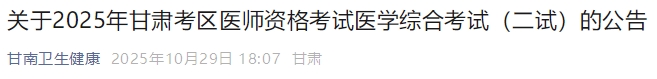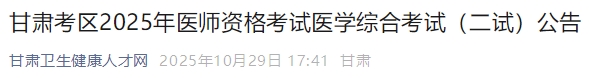為做好2025年醫(yī)師資格考試醫(yī)學(xué)綜合考試“一年兩試”工作,根據(jù)《國家衛(wèi)生健康委員會醫(yī)師資格考試委員會公告》(2025年第1號)統(tǒng)一安排,現(xiàn)將甘肅考區(qū)工作安排公告如下: