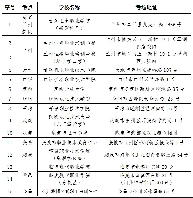 注:蘭州新區(qū)考點、甘南考點考生整體并入省直考點參加考試,嘉峪關(guān)考點考生整體并入張掖考點參加考試;平?jīng)隹键c中醫(yī)類別考生及隴南中醫(yī)類別執(zhí)業(yè)助理醫(yī)師考生并入省直考點參加考試。