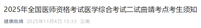 云南曲靖考點2025年臨床執(zhí)業(yè)醫(yī)師“一年兩試”考前注意事項已公布!醫(yī)學教育網(wǎng)整理具體內(nèi)容如下:
