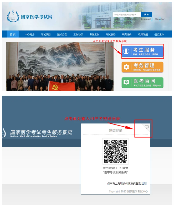 第一步:登錄國家醫(yī)學(xué)考試網(wǎng)(https://www.nmec.org.cn/),進(jìn)入“考生服務(wù)”,掃描二維碼或輸入用戶名和密碼,進(jìn)入系統(tǒng)自行打印準(zhǔn)考證,考生的具體考試時間、地點(diǎn)以準(zhǔn)考證為準(zhǔn)。