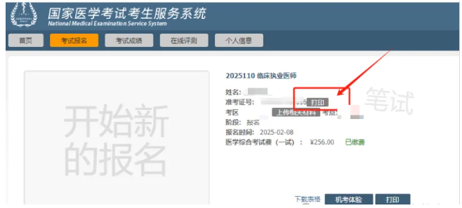 第二步:成功登錄后,進(jìn)入“考試報名”界面,點(diǎn)擊準(zhǔn)考證號右側(cè)的“打印”鏈接即可開始打印。