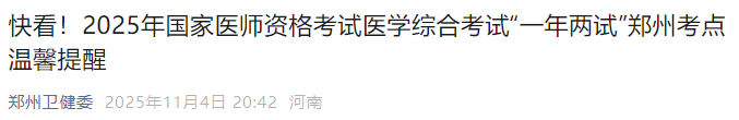 快看!2025年國家醫(yī)師資格考試醫(yī)學綜合考試“一年兩試”鄭州考點溫馨提醒