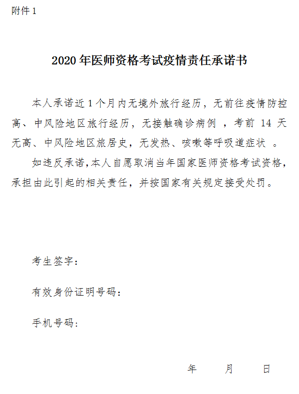 考生應(yīng)遵守考試疫情防控部門關(guān)于疫情防控的相關(guān)要求,并自覺填寫《2020年醫(yī)師資格考試疫情責(zé)任承諾書》(附件1),每個(gè)考生考試當(dāng)天要攜帶責(zé)任承諾書,按要求收繳存檔。