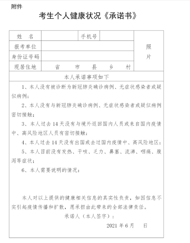 2.考生進(jìn)入考試基地時需攜帶如下材料:①準(zhǔn)考證考試日期7日內(nèi)有效核酸檢測證明(檢測機(jī)構(gòu)蓋章原件),費(fèi)用自理;②上交考生個人健康狀況《承諾書》(見附件2)按要求書寫工整、填寫完整,不得空項(xiàng);③有效身份證原件;④準(zhǔn)考證(彩色打印、照片清晰);⑤現(xiàn)場掃“龍江健康碼”“行程碼”;⑥個人防護(hù)用品。