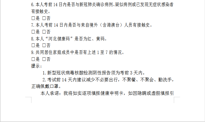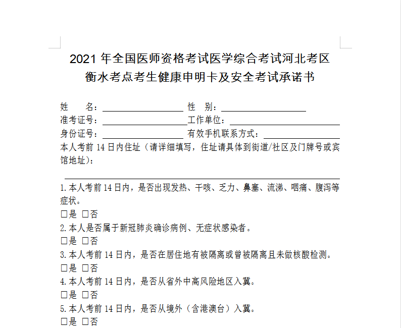 附件: 2021年全國醫(yī)師資格考試衡水考點(diǎn)考生健康申明卡及安全考試承諾書