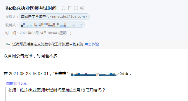 有學員給醫(yī)考中心發(fā)郵件咨詢“臨床執(zhí)業(yè)醫(yī)師考試時間是9月18日開始嗎?”,工作人員回復“以官網(wǎng)為準,時間差不多”。