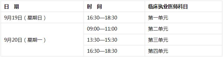臨床類別執(zhí)業(yè)醫(yī)師資格考試:2021年9月19日下午16:30-18:30和20日上午9:00-11:00,下午13:30-15:30、16:30-18:30。