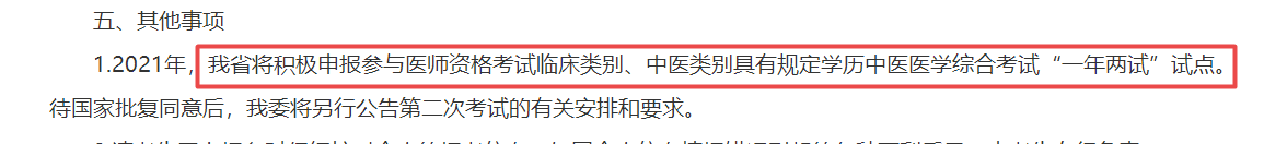 江西省衛(wèi)健委發(fā)布2021年江西省衛(wèi)生健康委員會公告(2021 年第1號)通知:江西省將積極申報(bào)參與醫(yī)師資格考試臨床類別、中醫(yī)類別具有規(guī)定學(xué)歷中醫(yī)醫(yī)學(xué)綜合考試“一年兩試”試點(diǎn)。待國家批復(fù)同意后,江西衛(wèi)健委將另行公告第二次考試的有關(guān)安排和要求。