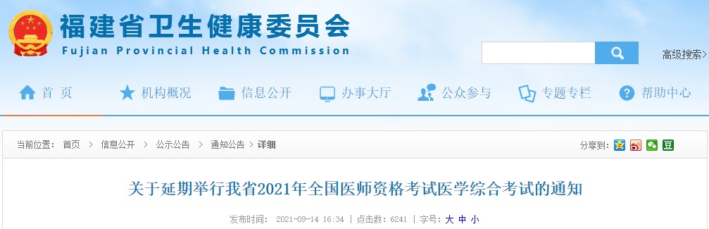 根據(jù)當(dāng)前我省疫情防控的形勢(shì),為減少人員聚集,集中力量做好我省疫情防控工作,經(jīng)國(guó)家衛(wèi)生健康委醫(yī)師資格考試委員會(huì)辦公室批準(zhǔn)同意,原定于9月18日至20日舉行的2021年全國(guó)醫(yī)師資格考試福建考區(qū)醫(yī)學(xué)綜合考試延期舉行。我辦將根據(jù)疫情防控形勢(shì)研判和國(guó)家部署,擇期開考。具體考試時(shí)間另行通知。