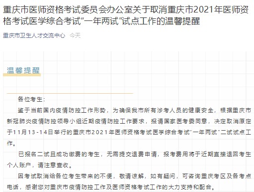 重慶市醫(yī)師資格考試委員會(huì)辦公室發(fā)布了關(guān)于取消重慶市2021年醫(yī)師資格考試醫(yī)學(xué)綜合考試“一年兩試”試點(diǎn)工作的溫馨提醒,鑒于當(dāng)前國(guó)內(nèi)疫情防控工作形勢(shì),為確保我市所有涉考人員的健康安全,根據(jù)重慶市新冠肺炎疫情防控領(lǐng)導(dǎo)小組近期疫情防控工作要求,報(bào)請(qǐng)國(guó)家醫(yī)考委同意,決定取消原定于11月13-14日舉行的重慶市2021年醫(yī)師資格考試醫(yī)學(xué)綜合考試“一年兩試”二試試點(diǎn)工作。