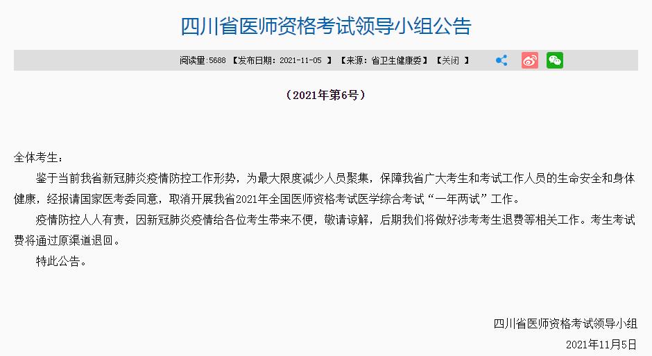 公告!四川考區(qū)2021年臨床執(zhí)業(yè)醫(yī)師一年兩試考試取消!具體通知內(nèi)容醫(yī)學(xué)教育網(wǎng)編輯整理分享如下: