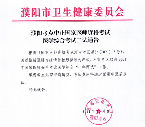 濮陽市2021年臨床執(zhí)業(yè)醫(yī)師綜合考試二試中止!紅頭文件發(fā)布!濮陽考點中止2021年國家醫(yī)師資格考試醫(yī)學綜合考試二試通告已發(fā)布,請大家及時查看。