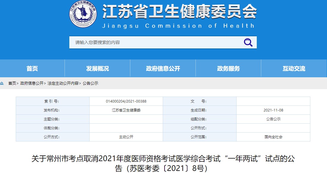 鑒于當前我省常州市新冠肺炎疫情防控工作形勢,為最大限度減少人員聚集,確保考生和考試工作人員的生命安全和身體健康,經(jīng)報請國家衛(wèi)生健康委醫(yī)師資格考試委員會辦公室同意,常州市考點取消2021年醫(yī)師資格考試醫(yī)學(xué)綜合考試“一年兩試”試點工作。我省其他12個設(shè)區(qū)市考點正常參加此次醫(yī)學(xué)綜合考試。