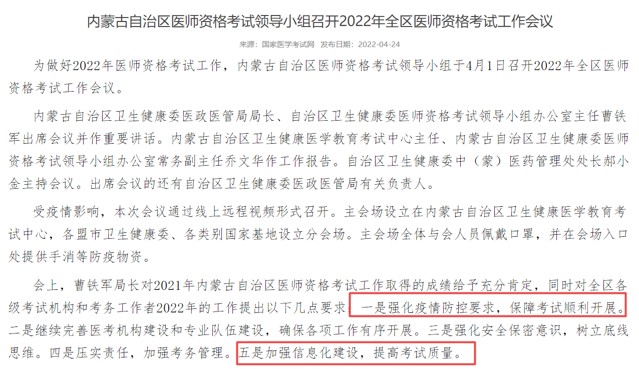 另外,內(nèi)蒙古考區(qū)官方也發(fā)布了一條關(guān)于2022年醫(yī)師資格考試安排的通告,其中要求今年的考試: